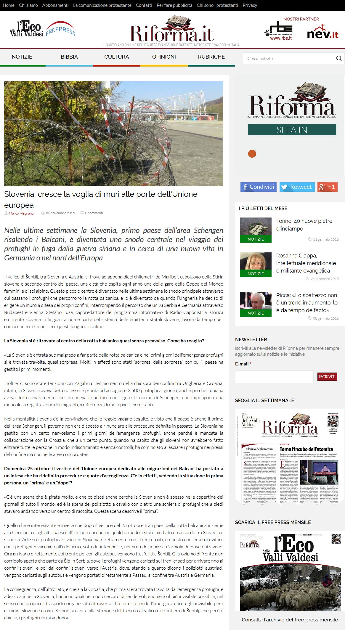 Intervista a Stefano Lusa sui nuovi muri in Europa, lungo la rotta balcanica, Riforma.it (Testata della Chiesa Valdese) 06/11/2015