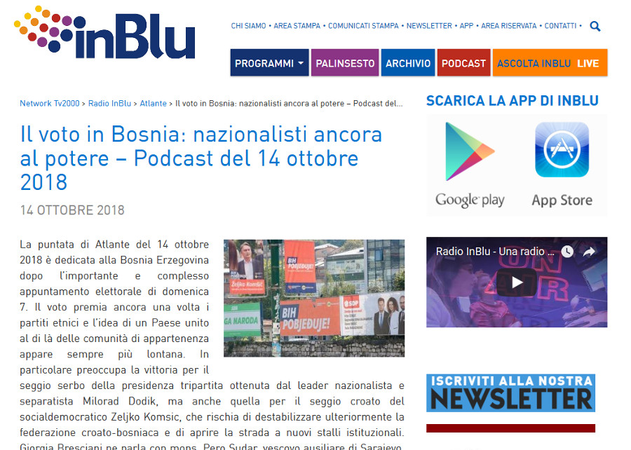 Intervista a Alfredo Sasso sui risultati delle elezioni svoltesi in Bosnia Erzegovina domenica 7 ottobre, Radio InBlu 14/10/2018
