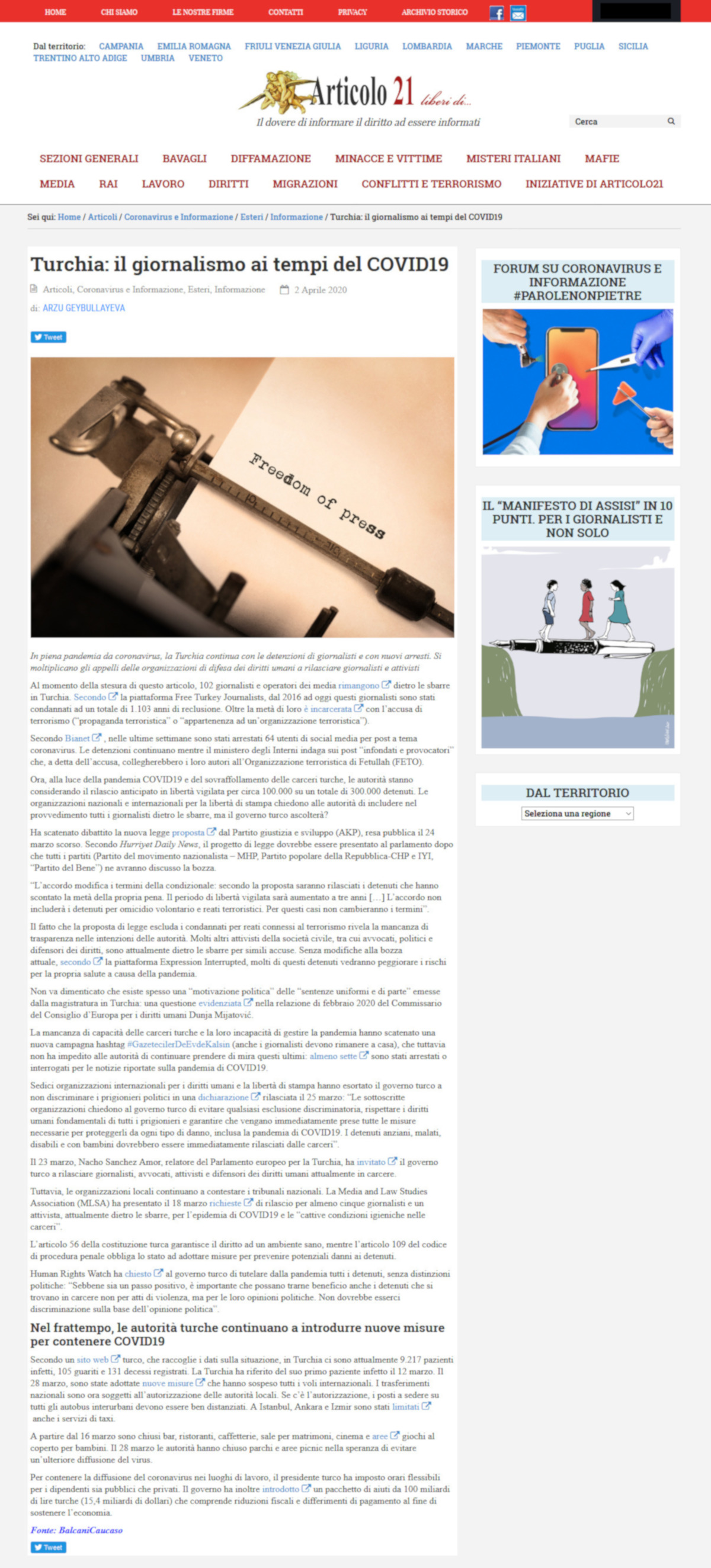 Ripubblicazione dell’articolo di Arzu Geybullayeva “Turchia: il giornalismo ai tempi del COVID19”, Articolo 21 02/04/2020