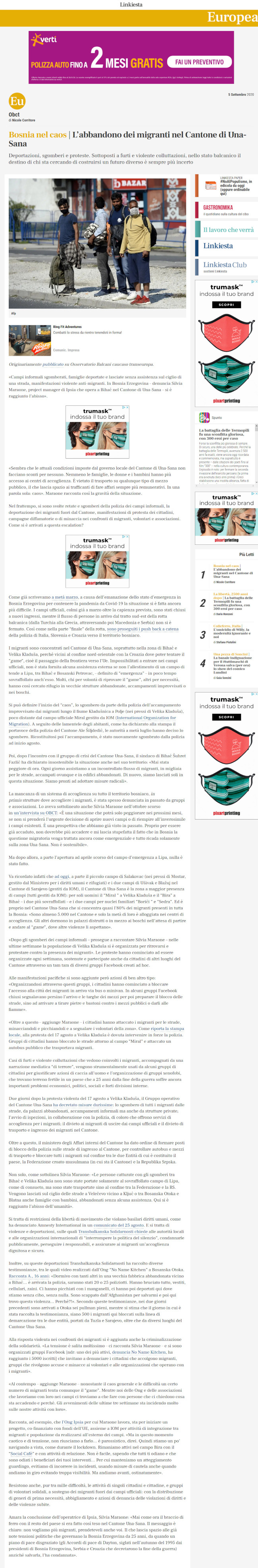 Ripubblicazione dell’articolo di Nicole Corritore “Migranti: caos Bosnia”, Linkiesta 05/09/2020