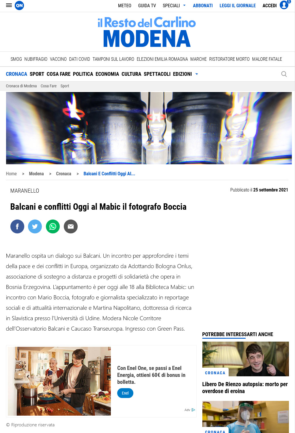Lancio dell’incontro “La guerra in Europa: ricordare Vukovar 30 anni dopo” di Maranello con Nicole Corritore, Il Resto del Carlino 25/09/2021