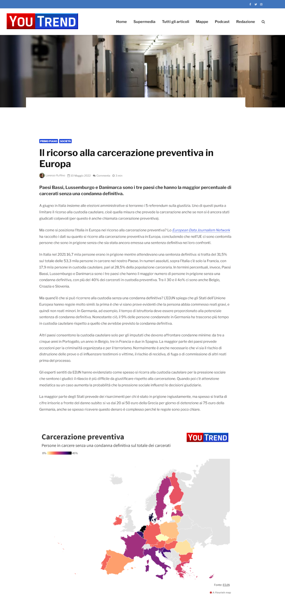 Articolo sul lavoro collaborativo EDJNet dedicato alla situazione dei detenuti sottoposti a carcere preventivo, You Trend 16/05/2022