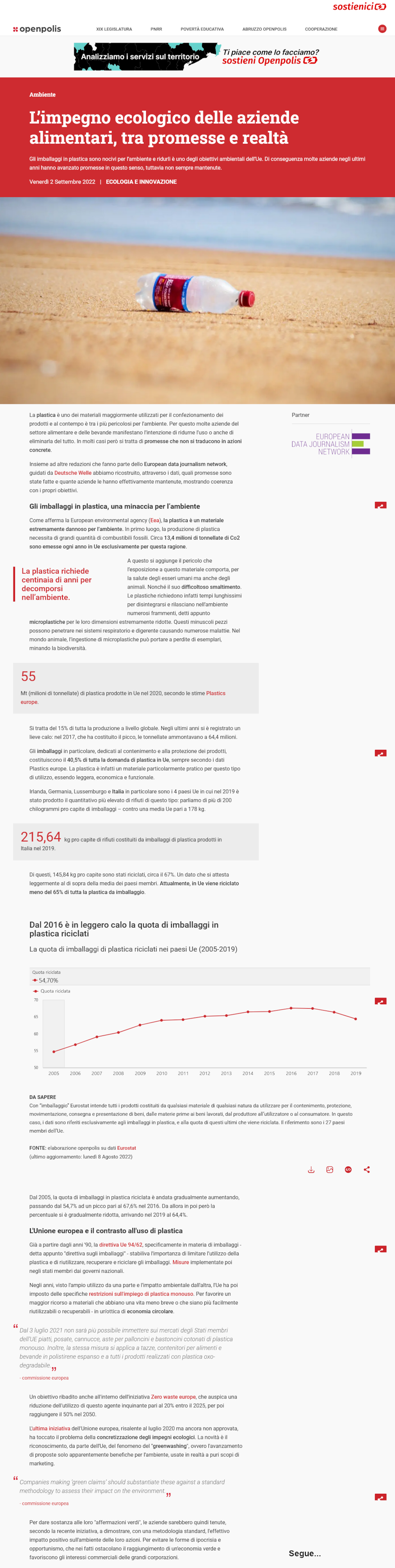 Ripubblicazione del lavoro collaborativo EDJNet “Riduzione della plastica delle aziende alimentari europee: solo promesse“, Openpolis 02/09/2022