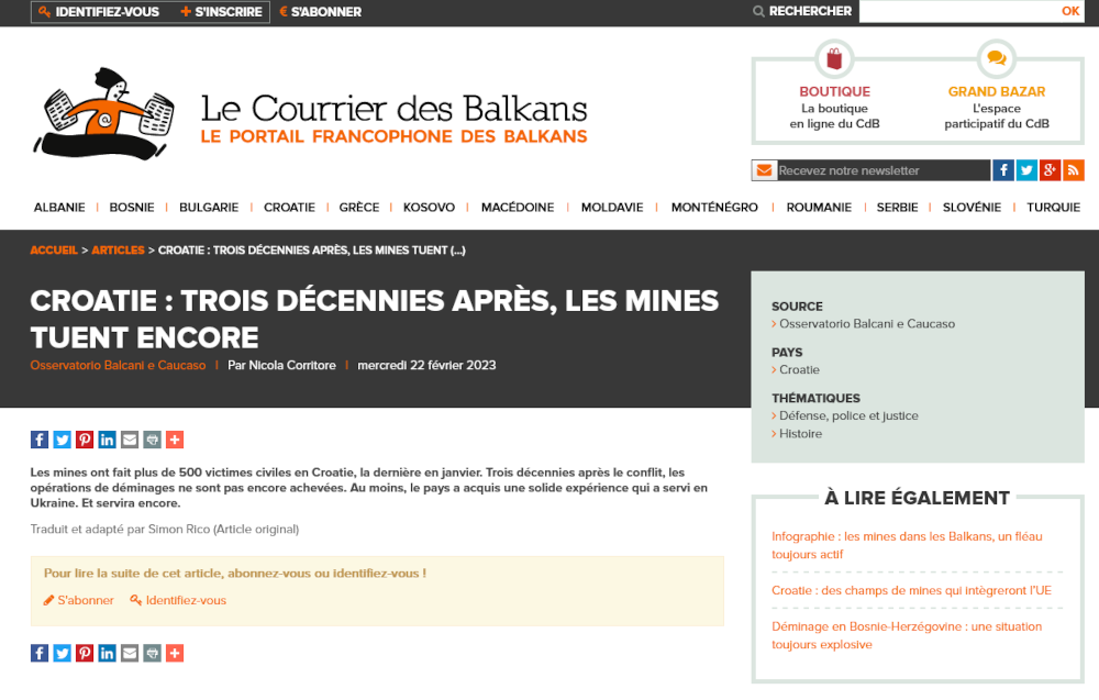 Ripubblicazione dell’articolo di Nicole Corritore “Croazia le mine uccidono ancora”, Le Courrier des Balkans 22/02/2023
