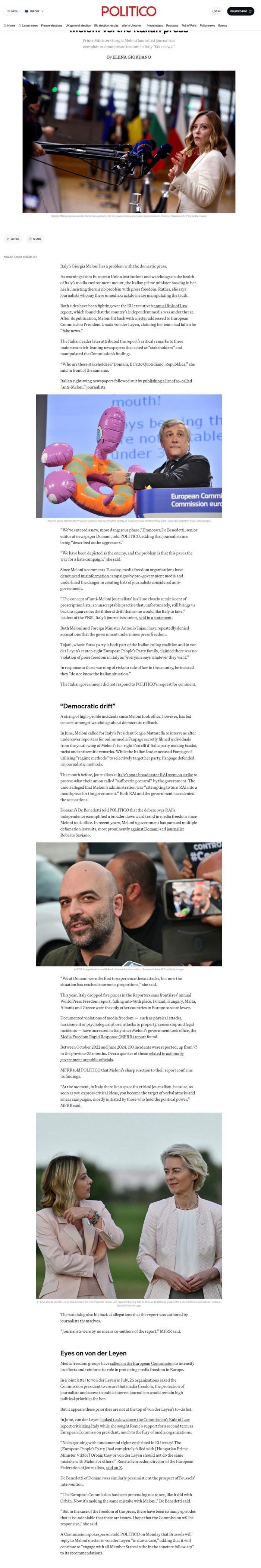 Approfondimento a seguito della pubblicazione del rapporto sullo stato di diritto e del report MFRR, Politico 07/08/2024