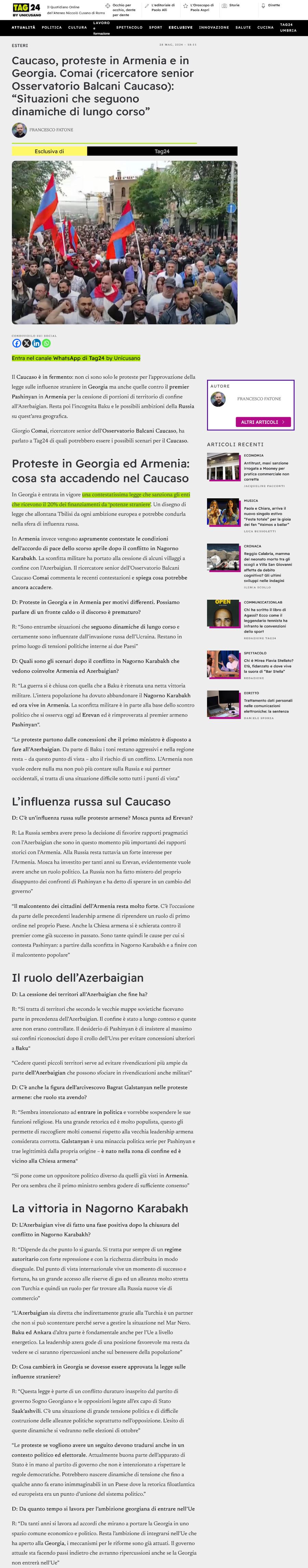 Intervista a Giorgio Comai sulla situazione in Georgia e in Armenia e in generale nella regione del Caucaso, Tag24 28/05/2024