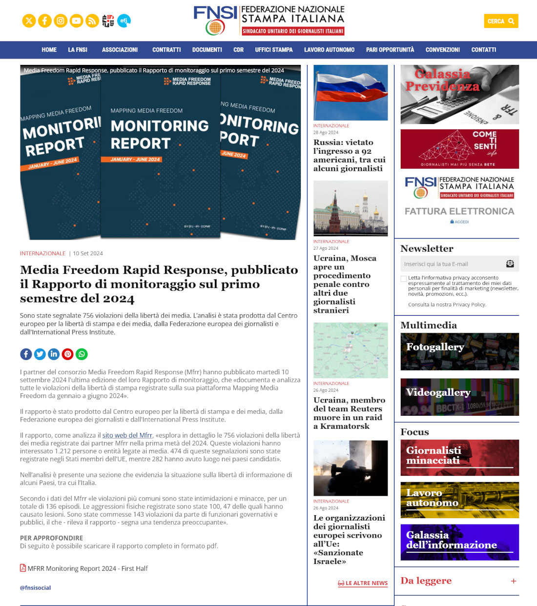Ripubblicazione del report del consorzio MFRR di cui OBCT è membro “MFRR Monitoring Report: January - June 2024”, FNSI 10/09/2024